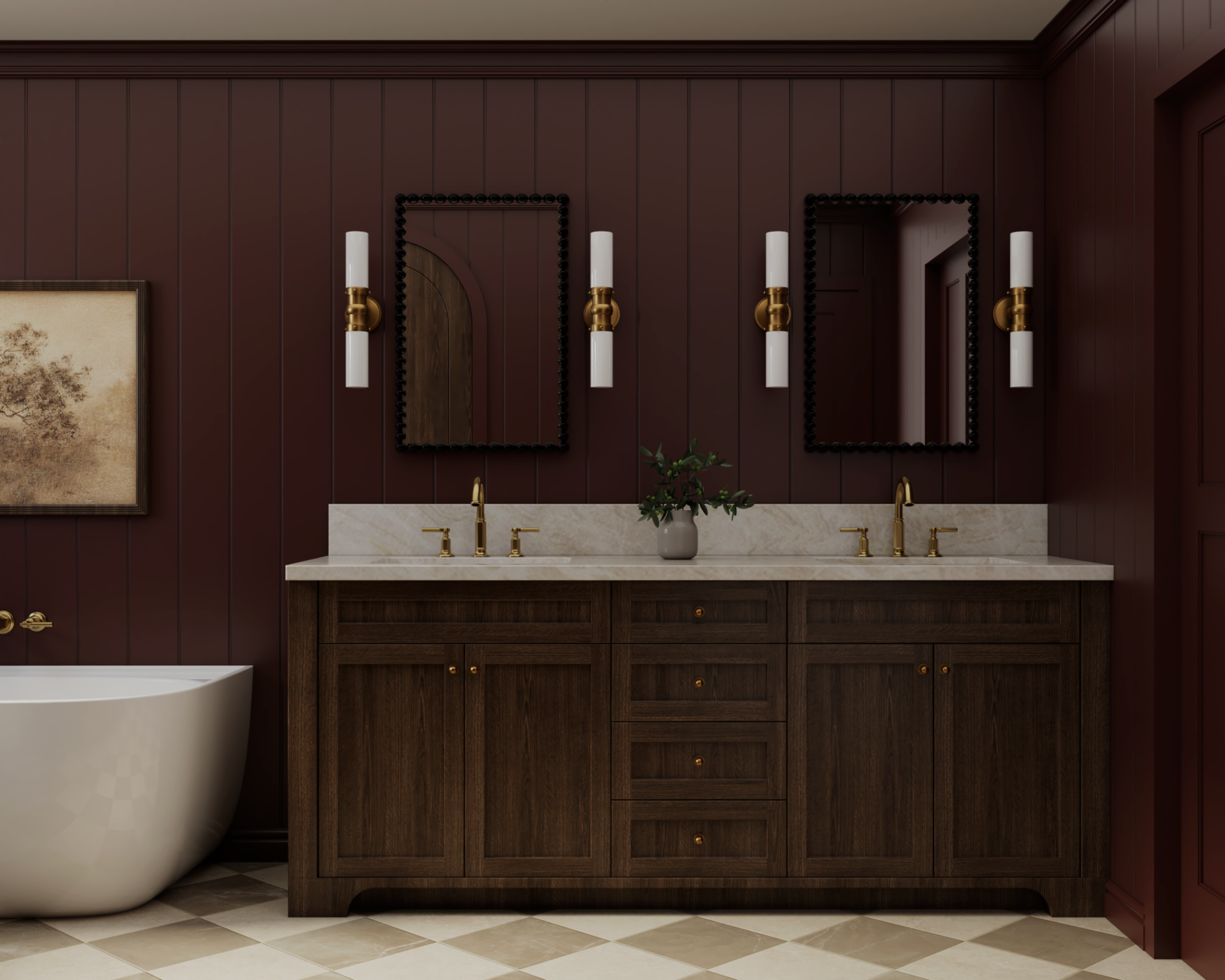 Burgundy walls and trim adds a touch of drama, bringing a bold personality to the room but without overwhelming the space. To keep things balanced, we used light floor tiles, an off-white ceiling, and a beautiful Taj Mahal quartzite countertop. The beige shower tiles tie everything together and help soften the overall look. It’s a cozy, moody space with just the right mix of contrast and light.