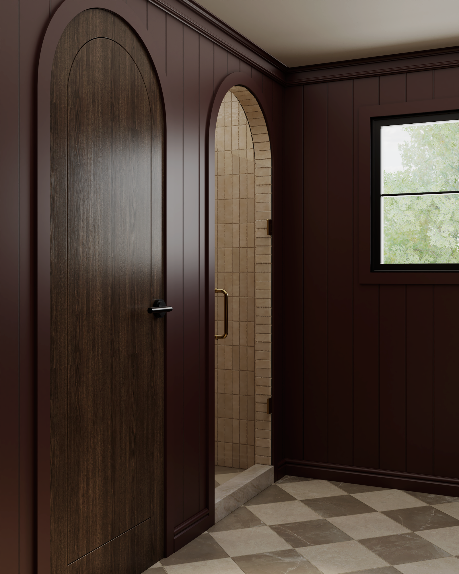 Burgundy walls and trim adds a touch of drama, bringing a bold personality to the room but without overwhelming the space. To keep things balanced, we used light floor tiles, an off-white ceiling, and a beautiful Taj Mahal quartzite countertop. The beige shower tiles tie everything together and help soften the overall look. It’s a cozy, moody space with just the right mix of contrast and light.